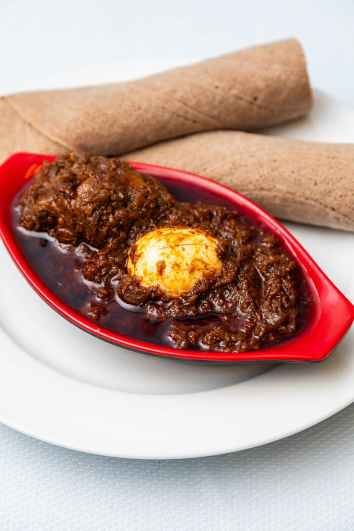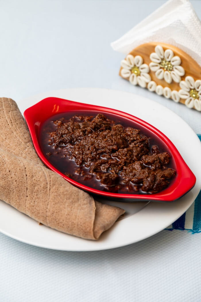 Spiced Chickpea flour cooked with berbere sauce, Oil, Onion, Garlic and ginger served with Injera.